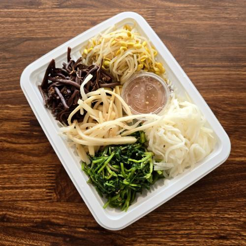 고사리/콩나물/무/미나리나물/도라지/수제간장으로 구성합니다.